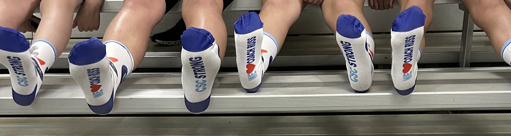 Some early morning fun at MPCC wearing the crazy CSC socks designed by Emma Wall! #CSC STRONG! We love Coach Russ!